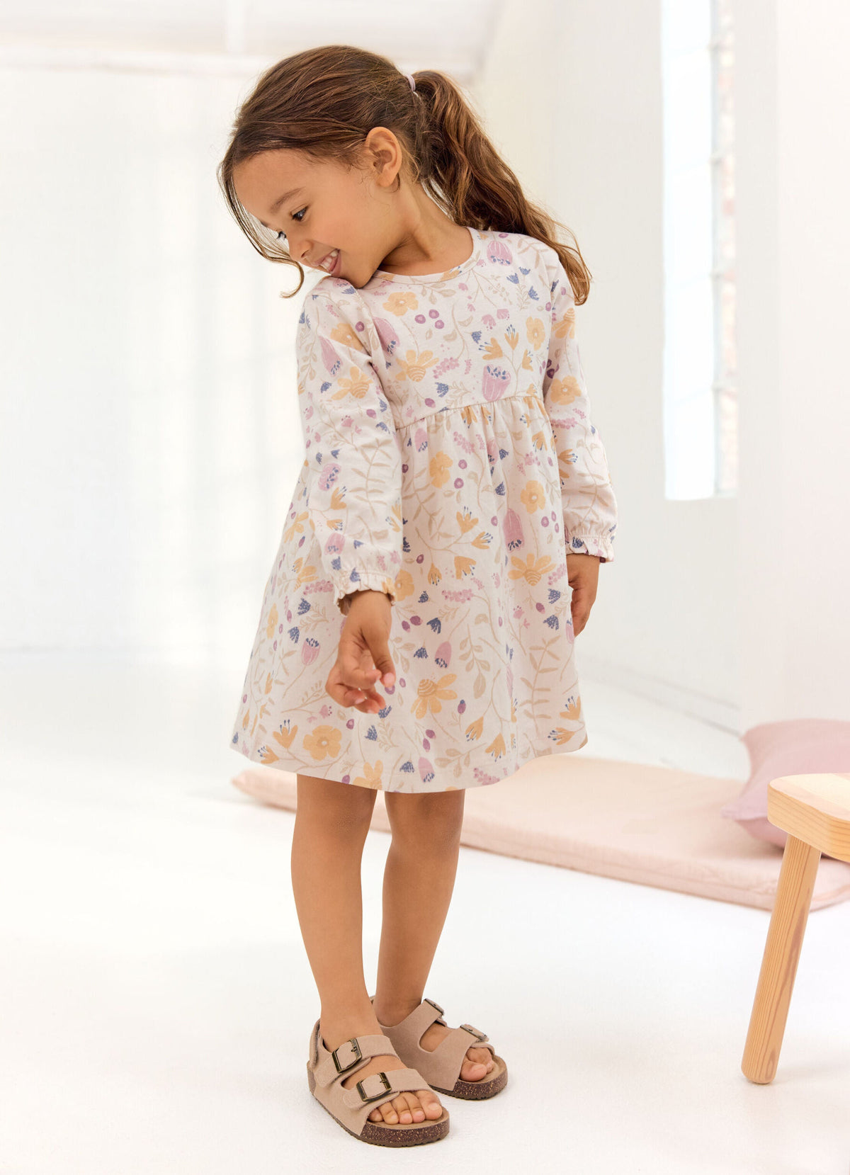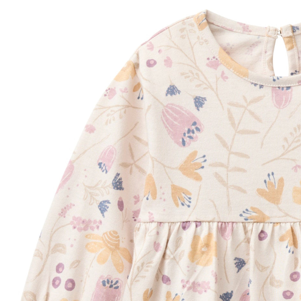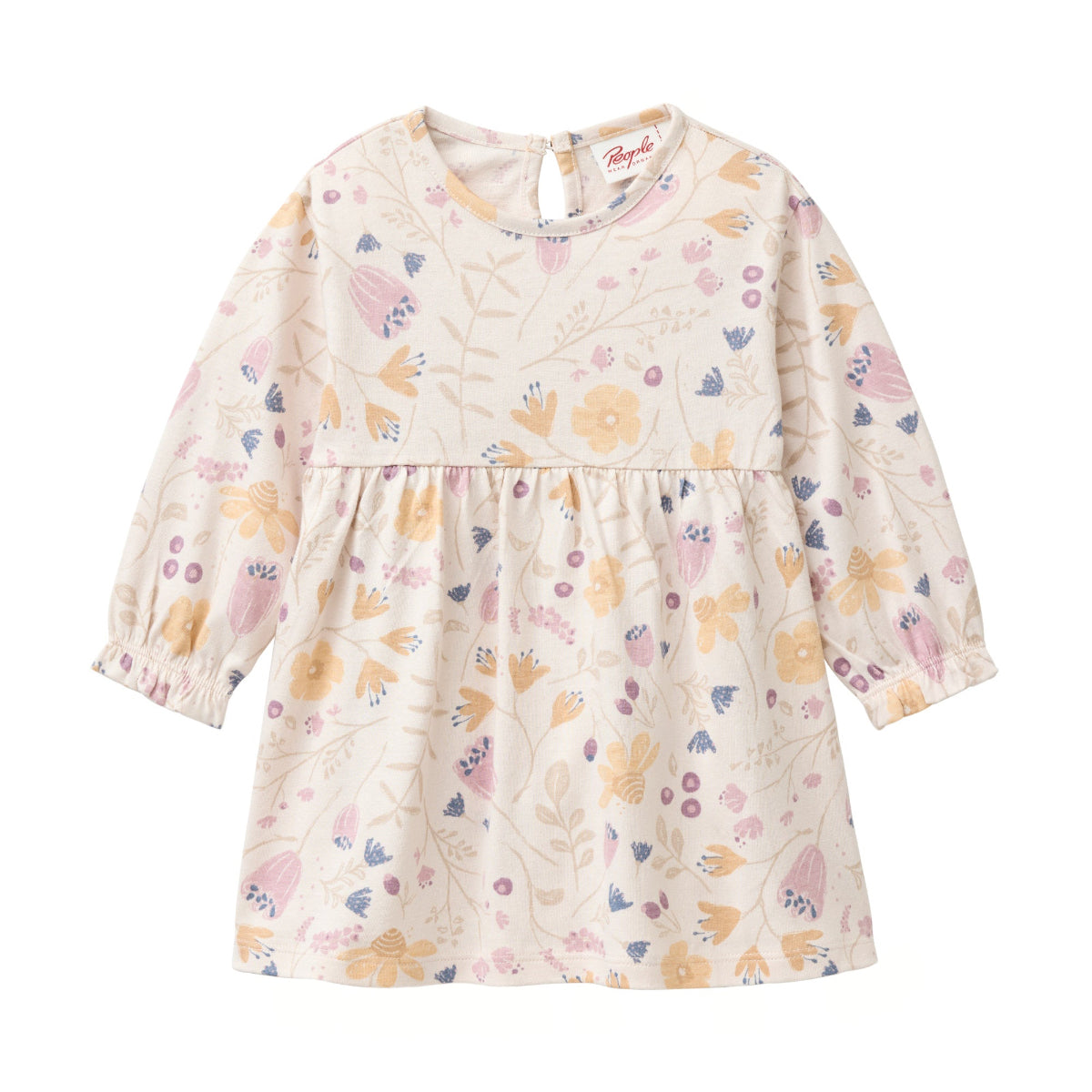 Delizioso abitino in 100% Cotone Biologico certificato GOTS. Base Cipria e stampa a fiori sui toni del Malva e Albicocca.