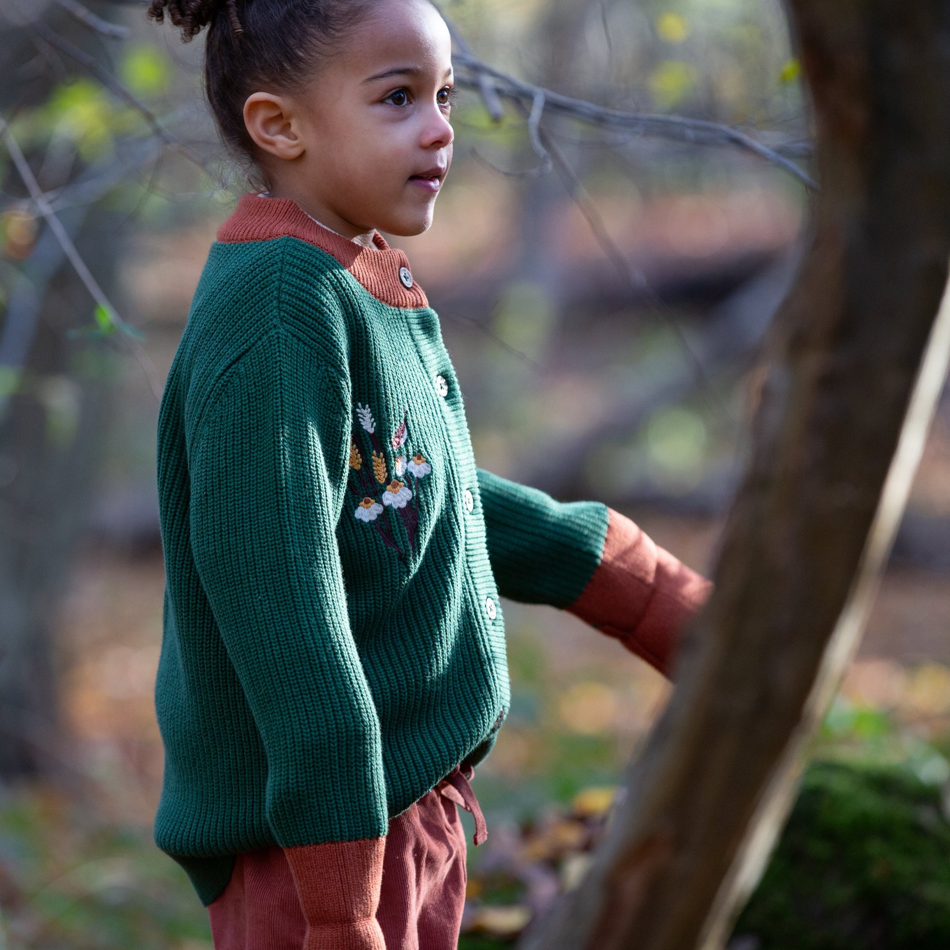 Realizzato in morbidissima maglia di Cotone Biologico con bottoncini in legno, fondo Verde Bosco e dettagli in contrasto.