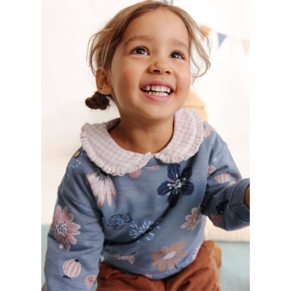 Felpa in Cotone Biologico certificato GOTS. Fondo Blu Polvere con un leggero effetto mélange e stampa a fiori. Fondo, polsini e scollo rifiniti a costina. Fino alla taglia 104 cm sono presenti due bottoncini in legno sulla spalla che rendono il momento del cambio più agevole anche per i più piccini.