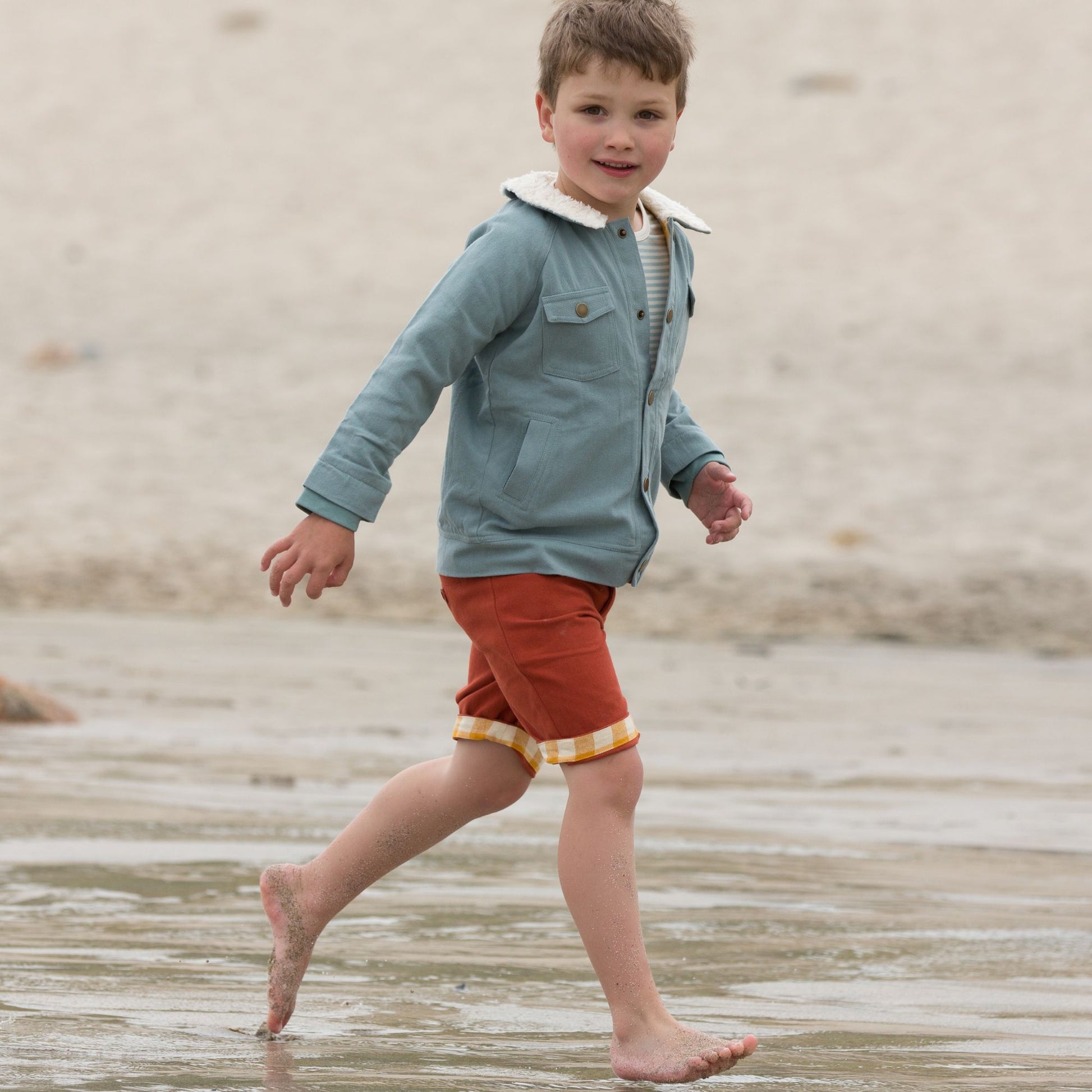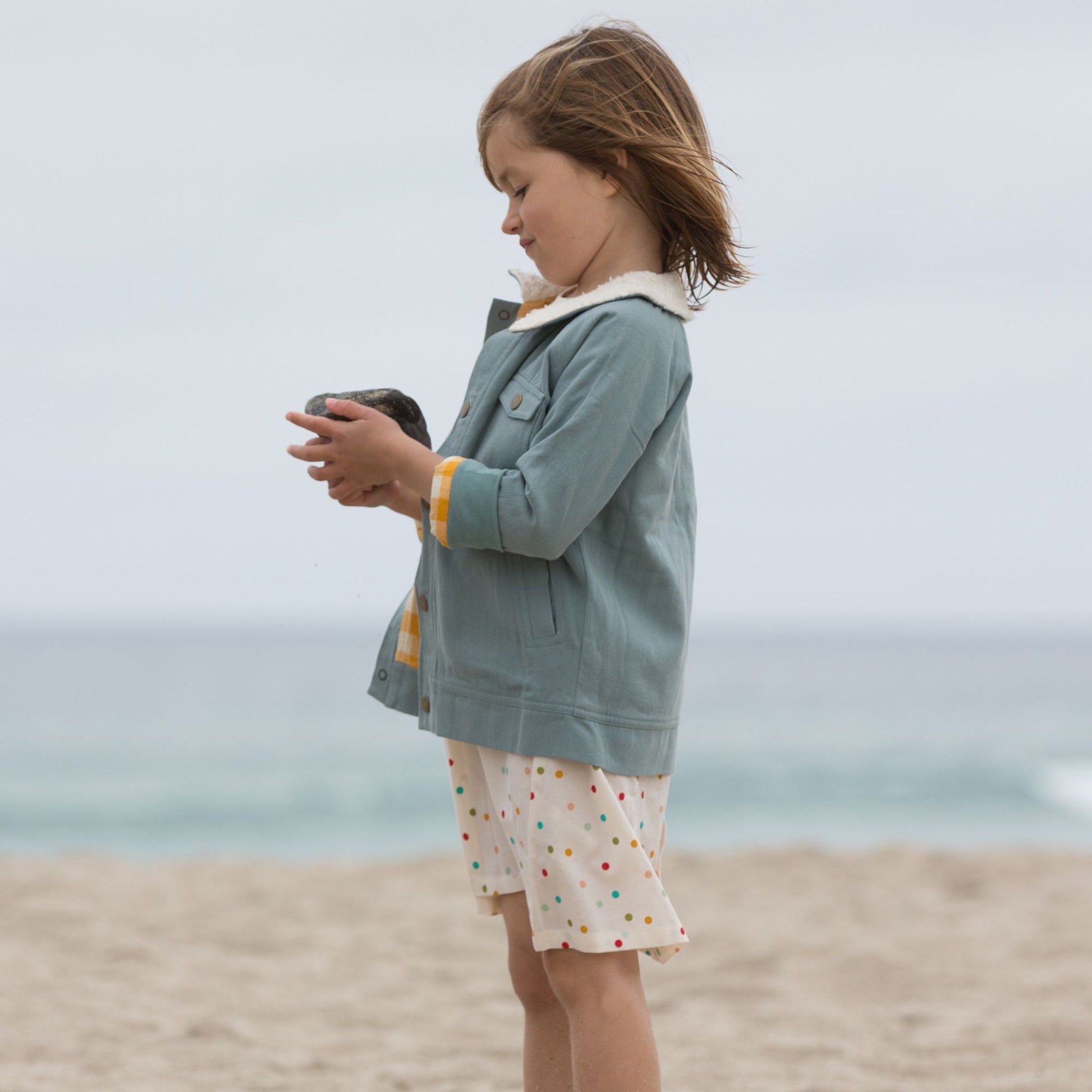 Un modello unisex, perfetto da indossare per le avventure primaverili all’aria aperta. Taglio dritto e comodo, con due tasche laterali e due frontali per riporre i tesori trovati qua e là. Chiusura con bottoni a pressione.