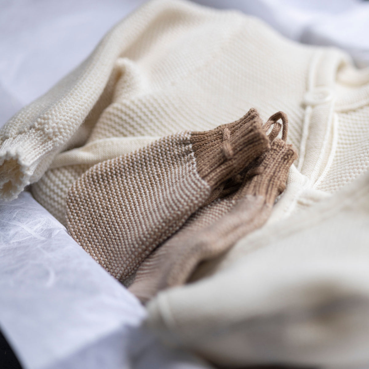 Guanti da neonato realizzati in 100% lana merino biologica certificata GOTS e Mulesing free.