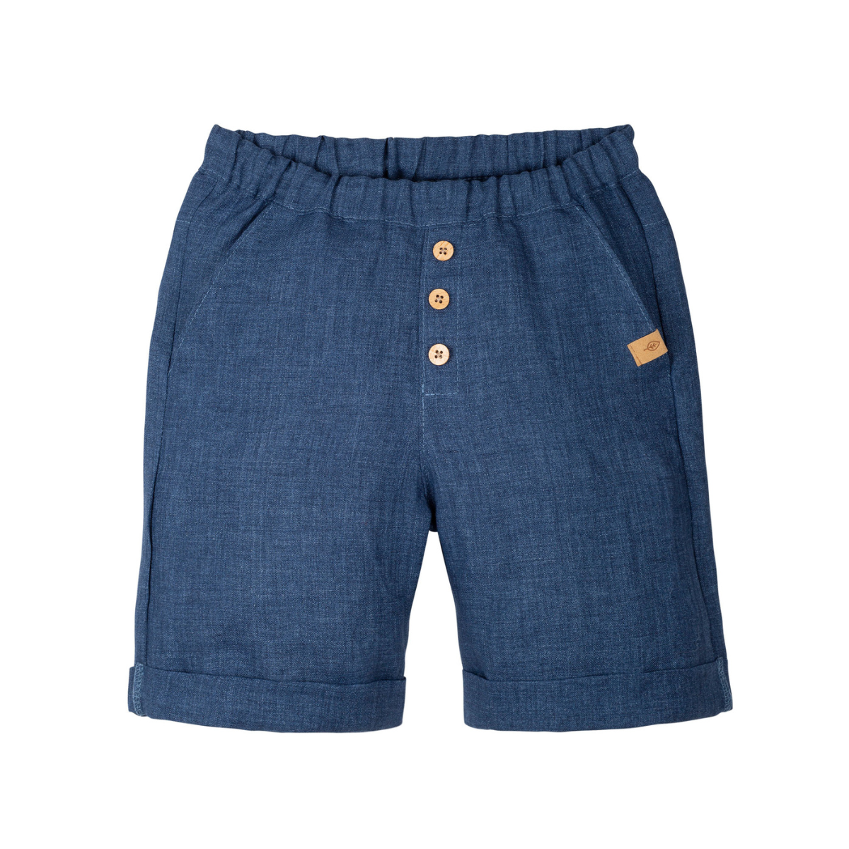 Pantaloncino in 100% Lino biologico. Vita elastica, tre bottoncini decorativi in legno davanti e taschine laterali.