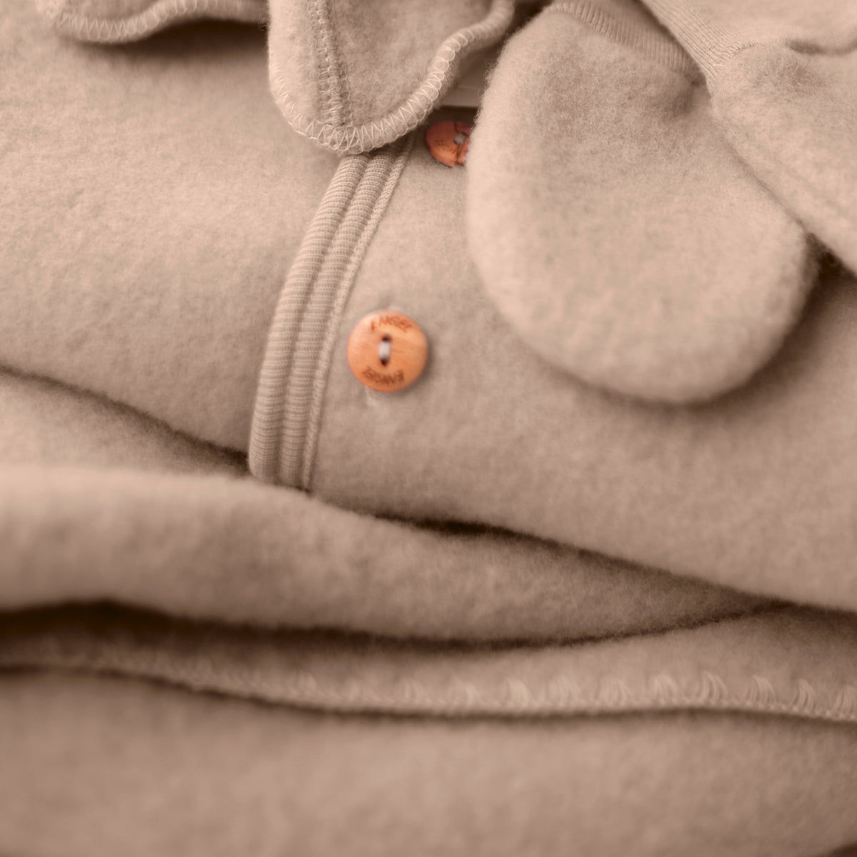Bottoni di chiusura frontale in legno. Piedini e manopole risvoltabili per avvolgere completamente il neonato anche nelle giornate più fredde.